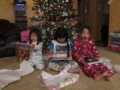 Opening their Christmas Eve gift. They all got a Boogie Board which is a weird name for an updated type of magnadoodle that uses e ink instead of magnets. They are always drawing in the car so I thought this would be easier to carry around.