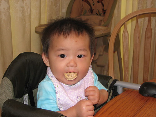 I will have photos up from this weekend soon, but I just wanted to post Nadia’s accomplishment today. And I had to put up this cute little photo. We have been working with her on “self feeding” the little Gerber puffs. She doesn’t want to do it, she just wants to be fed. She will go to extreme lengths to get the puff in her mouth without the use of her hands. She could put some Pilates/yoga doing women to shame with these moves.