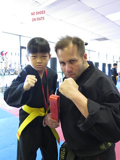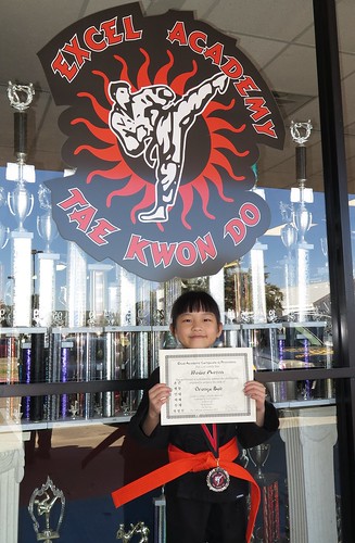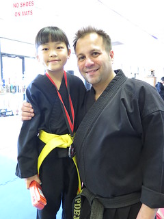 With Master Valdez after earning her Orange Belt.