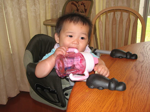 But today I put the puffs down where she couldn’t quite bend to get them and she put her head down and used her hand to scoot the puff to her mouth. Yeah for her. So I did it again. She tried to get it that way again, but it didn’t work. So she picked it up with her right hand and made a fist. Then she opened her hand and looked at the puff. I said, “You can do it, put it in your mouth.” She opened and closed her hands a couple more times and then popped it in her mouth. I cheered and clapped and she started laughing with a look like, “Sheesh I didn’t know it was so important.” Hee hee.