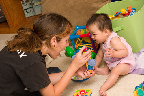 So she did it two more times with more laughing and cheering and then decided she was done with that and it was time to play. We knew she “could” do it, but she just prefers us to do it. She cracks me up. She is also cruising the furniture like a speed racer and more and more often I see her let go with both hand and try to stay up. She collapses almost immediately, but it’s fun to see her try.