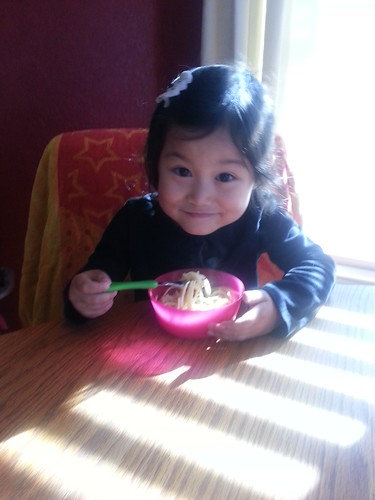 We gave away the highchair and this is Dani’s first meal in a booster seat.